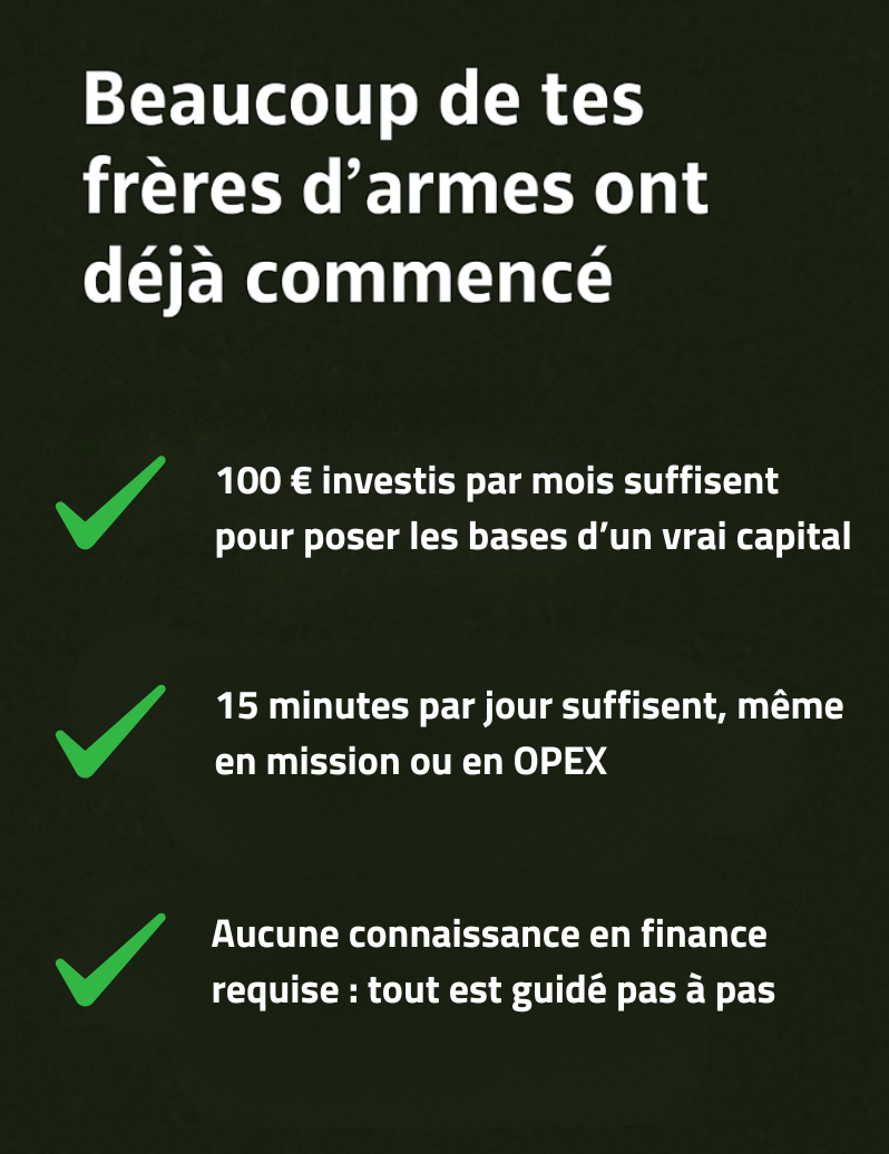 Non. 100 € par mois suffisent pour poser les bases solides. C’est pensé pour être accessible à n’importe quel militaire, même en début de carrière.